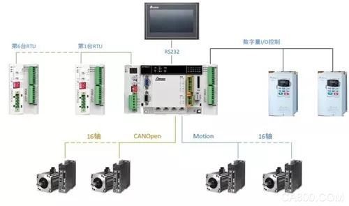 如圖所示,臺達(dá)多軸運動控制器DVP-15MC系列配置外部編碼器為主控制器,搭配人機(jī)界面DOP-B系列以及其他控制元件(RTU-DNET遠(yuǎn)程DeviceNET模塊、 DeviceNet主站模塊等),可以監(jiān)控修改編碼器位置,在觸摸屏內(nèi)能夠存儲至少100種車型數(shù)據(jù),可以隨時調(diào)用;程序可以在線修改并下載,達(dá)到靈活運動控制。