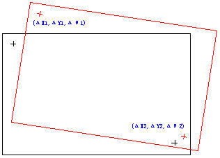 由于材料本體尺寸比較大,如果將被測(cè)物完全拍攝到,則其檢測(cè)精度必然無法達(dá)到要求。所以考慮只拍攝該板材上的上下兩個(gè)MARK(標(biāo)記)的位置,獲知兩個(gè)MARK點(diǎn)的偏移量后可通過推導(dǎo)得出該板材的整體偏移量以及旋轉(zhuǎn)角度。