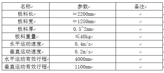 甲方目前使用人工搬運(yùn)方式,將所需切割板料搬運(yùn)到激光數(shù)控切割機(jī)。此搬運(yùn)方式需要至少兩個(gè)人配合,且勞動(dòng)強(qiáng)度大。為了解決目前情況,我公司專門設(shè)計(jì)自動(dòng)物料搬運(yùn)設(shè)備,此設(shè)備只需一人操作,通過(guò)按鈕手動(dòng)控制抓取物料后即可自動(dòng)上料并返回取料位置。