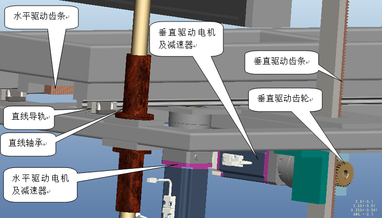 傳動(dòng)系統(tǒng)采用齒輪齒條傳動(dòng),并配置臺(tái)達(dá)帶剎車的伺服電機(jī)(確保斷電后還能保證抓手部件下滑)以及新寶減速器。齒輪齒條運(yùn)動(dòng)平穩(wěn)可靠,并且性價(jià)比極高,此設(shè)計(jì)可以有效減輕甲方的采購(gòu)成品。