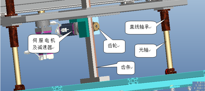 傳動(dòng)系統(tǒng)采用齒輪齒條傳動(dòng),并配置臺(tái)達(dá)伺服電機(jī)及新寶減速器。齒輪齒條運(yùn)動(dòng)平穩(wěn)可靠,并且性價(jià)比極高,此設(shè)計(jì)可以有效減輕甲方的采購(gòu)成品。
