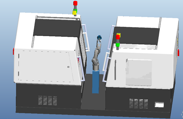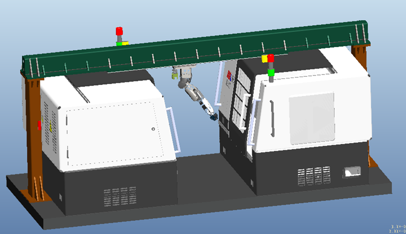 e)    方案二減小目前機(jī)床的間距為700mm甚至更小。優(yōu)點(diǎn)是設(shè)備投入小,缺點(diǎn)是不利于后期機(jī)械手和機(jī)床的維護(hù)。