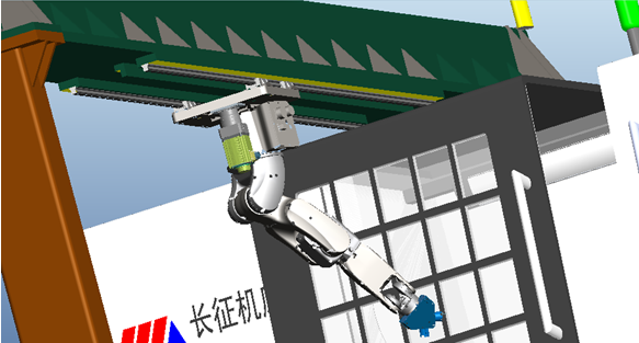 d)    方案一增加機(jī)器人第七軸。優(yōu)點(diǎn)是保證磨床間距不變,缺點(diǎn)是需要提高七軸的精度和增加桁架。