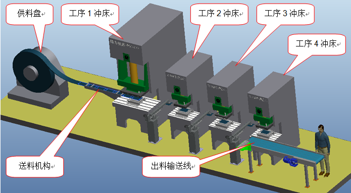 此生產(chǎn)線主要完成機頂盒外殼的沖壓工作。主要由供料系統(tǒng)、沖孔落料工位、凸臺成型工位、小邊折彎整形工位、外殼成型工位、搬運系統(tǒng)、出料輸送線等構(gòu)成。