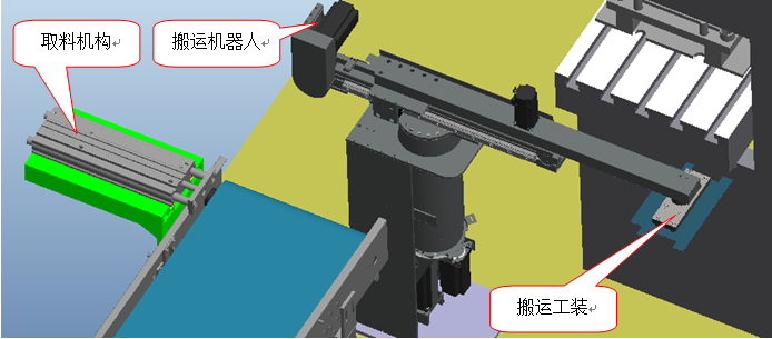 其主要功能是對機頂盒外殼成型工序末端沖床取料,并將工件傳送到安全范圍方便人工卸料碼放。