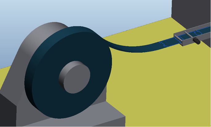 此系統(tǒng)主要完成機頂盒外殼工序1的自動送料工作;鑒于外殼原料的特點,選擇卷材作為原料,通過一系列機構(gòu)定長度給沖孔落料工位送料。此系統(tǒng)設(shè)計特點是:上料周期長,一次上料可供8小時左右的沖孔落料;自動化程度高,根據(jù)不同品種、不同節(jié)拍生產(chǎn)的要求,自動調(diào)節(jié),無需人工干預(yù)。
