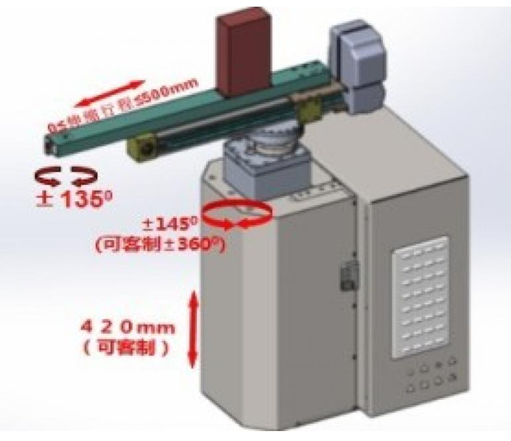 J3軸:伸縮;標(biāo)準(zhǔn)機活動半徑1250MM,有效行程可做到500MM;
