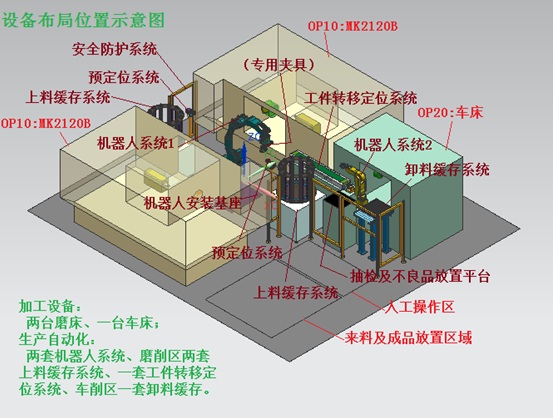 該自動生產(chǎn)線由OP10磨床2臺、OP20車床1臺、機(jī)器人系統(tǒng)2套(含夾具及基座)、磨床上料緩存系統(tǒng)2套(含預(yù)定位對刀系統(tǒng))、工件轉(zhuǎn)移定位系統(tǒng)1套(含抽檢及放置平臺)、OP20卸料緩存裝置1套、安全防護(hù)系統(tǒng)和電器控制(本方案中未作示意)系統(tǒng)組成。