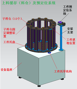 主要由具備分度轉(zhuǎn)位的工件托盤、工件托舉機(jī)構(gòu)、12個子料倉和設(shè)備箱座及電器控制等部分構(gòu)成。
