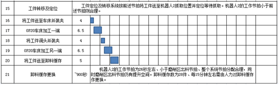 磨削區(qū)設(shè)置兩套上料緩存系統(tǒng)、總緩存數(shù)量達(dá)到240件;車削區(qū)設(shè)置卸料緩存、緩存數(shù)量為28件(這個緩存方式可視為臨時處理方式【本方案】、在對后續(xù)工序作相關(guān)改造后可以取消該卸料緩存從而提高整個生產(chǎn)線的自動化水平?。?br/>4)生產(chǎn)準(zhǔn)備時由人工在上料位置完成上料緩存,確認(rèn)設(shè)備工作條件后、啟動齒輪加工系統(tǒng)(包括OP10、OP20及相關(guān)自動上下料相關(guān)設(shè)備),機(jī)器人1為OP10的兩臺設(shè)備上料并卸下其加工完成的工件至“工件轉(zhuǎn)移定位系統(tǒng)”的指定位置;