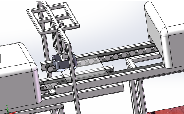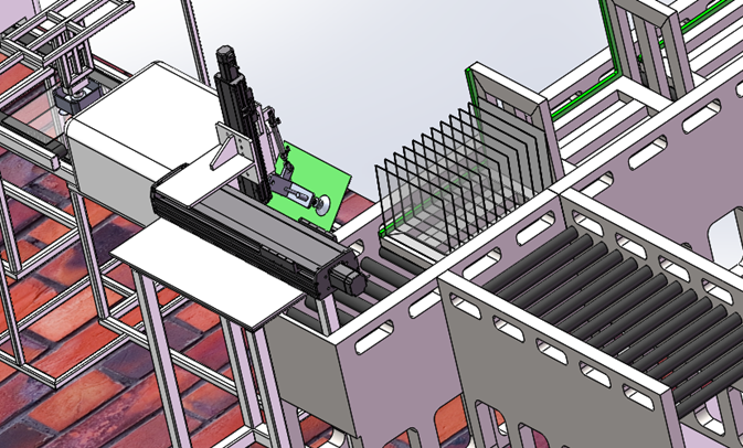 四軸上料機器人負(fù)載將堆放好毛玻璃通過X軸、Y軸、Z軸和R軸搬運到寬邊磨邊機的傳送鏈上,由磨邊機進(jìn)行位置調(diào)整,調(diào)整完成后進(jìn)入寬邊加工件,對毛玻璃的4個面進(jìn)行加工。X軸集成在上料滾筒輸送鏈上,實現(xiàn)料倉的自動進(jìn)給和無間歇式換料。