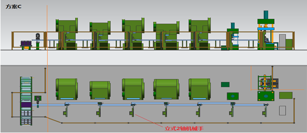 方案C:壓機(jī)上下料使用立式單臂機(jī)械手。