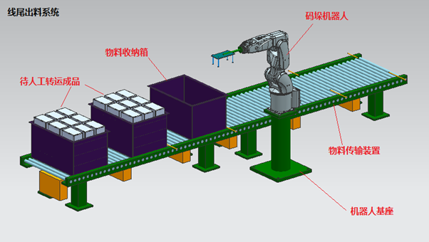 該系統(tǒng)示意參見下圖、主要由物料(收納箱)傳輸裝置、碼垛機(jī)器人系統(tǒng)、檢驗(yàn)平臺(tái)(圖中未示意)、物料收納箱構(gòu)成。