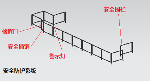安全是開展生產(chǎn)活動(dòng)的大前提、安全防護(hù)系統(tǒng)在自動(dòng)化生產(chǎn)線中又顯的特別重要。該系統(tǒng)主要由完全圍欄、安全插銷、檢修門和警示燈等構(gòu)成。安全圍欄的范圍要考量到裝備的檢修和執(zhí)行端更換等空間位置。