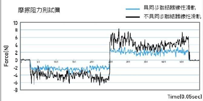 對于進(jìn)給精度有較高要求的工作機(jī)臺,除了要有精確的運動控制與良好的傳動裝置外,更需要運行阻力變動微小的線性滑軌提供乘載功能。然而,一般不具同步聯(lián)結(jié)器技術(shù)之線性滑軌,開始運行時,負(fù)荷側(cè)的滾動組件會先運動,再推擠滾動循環(huán)回轉(zhuǎn)向部與非負(fù)荷側(cè)內(nèi)的滾動組件,造成連鎖的推擠碰撞,使得運行阻力變動起伏劇烈。而具有同步聯(lián)結(jié)器的線性滑軌,將同一循環(huán)內(nèi)的所有滾動組件串聯(lián)在一起,進(jìn)行同步運動,所以當(dāng)線性滑軌開始運動時,所有滾動組件幾乎同時運動,且滾動組件之間并無差排的碰撞,在保持一定的運動慣性下,運行阻力的變動幅度當(dāng)然能有效的減少并保持穩(wěn)定(如圖6所示)。