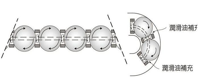 為了達(dá)成高速的應(yīng)用,線性滑軌的設(shè)計須使用滾動組件的循環(huán)系統(tǒng),以減小運行阻力,并提高其運行速度。由于線性滑軌的機(jī)械特性大都取決于滾動組件與滑塊、滑軌之間的接觸關(guān)系,除此之外,循環(huán)系統(tǒng)的阻力以及滾動組件相互之間的阻力大小,即是設(shè)計上主要可以改進(jìn)的部份。如圖3所示;相鄰的兩個滾動組件在運行時,其接近處的運動方向是相反的。若此處為接觸狀態(tài),則摩擦阻力將提高甚多,進(jìn)而大大影響其高速性能。