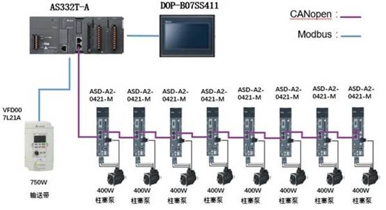 臺達直線灌裝設備控制解決方案主要采取可編程控制器(PLC)AS300系列加AS-FCOPM通訊功能卡、伺服驅動器ASDA-A2系列通過CANopen總線,利用臺達專屬驅動模式的便捷指令實現(xiàn)灌裝軸的精確控制。